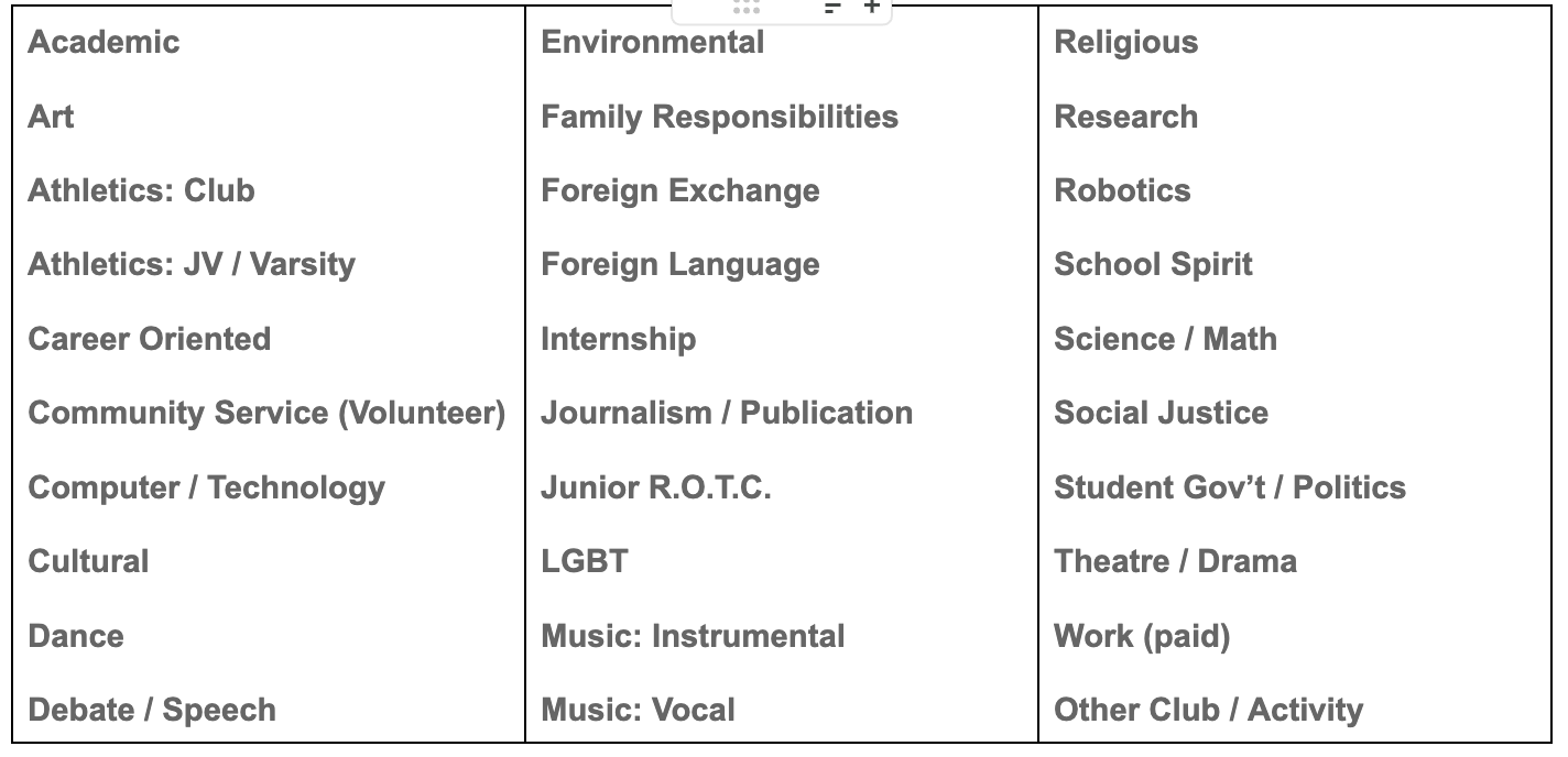 The Common Application asks you to select an activity type, and reviewing this helpful list can often jog your memory -