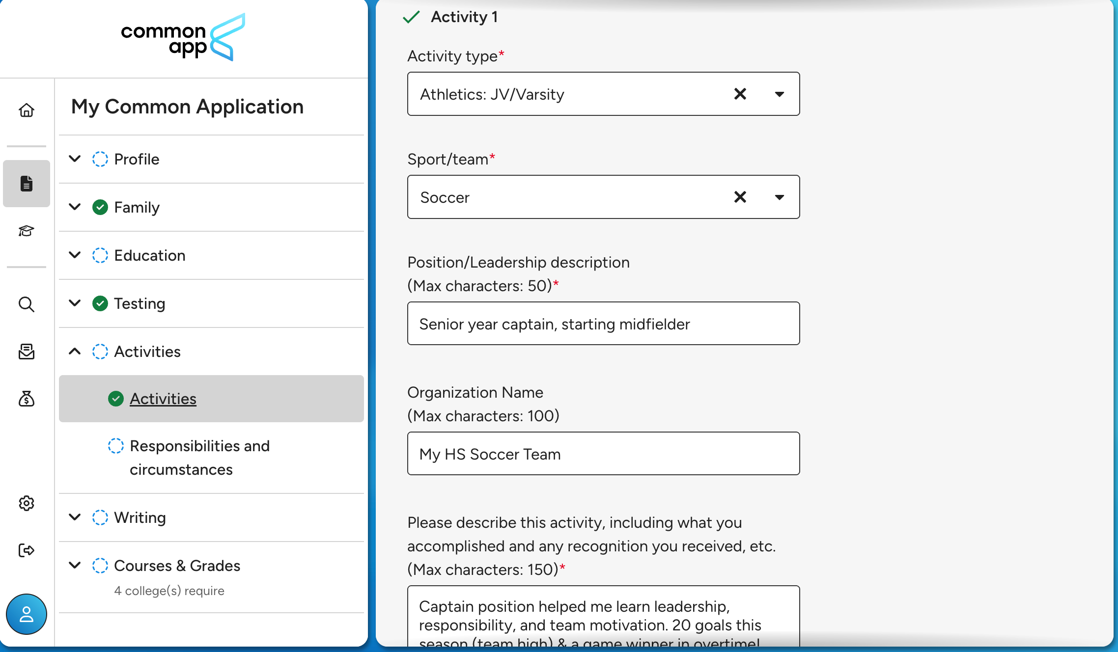 Information included in the ‘Activities’ section of your application will be sent to all your colleges and universities.