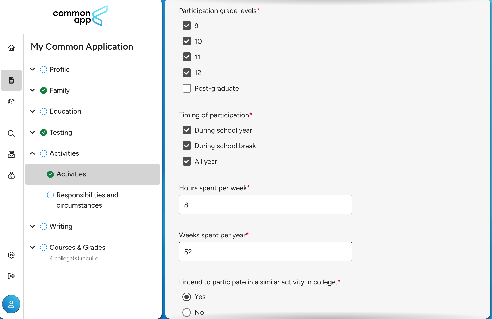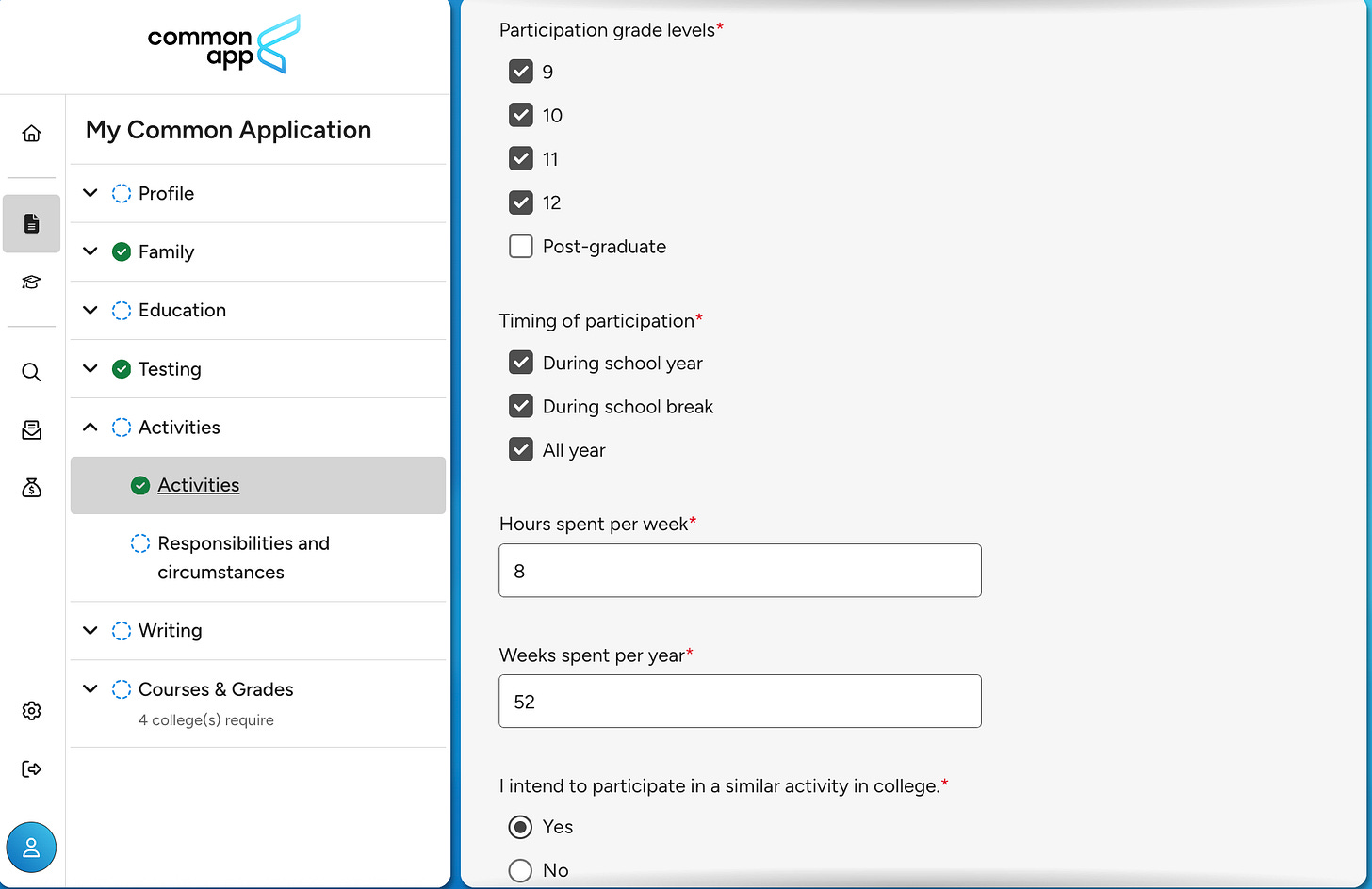 If you believe you’ll be continuing an activity during your senior year of high school, go ahead and indicate grade ‘12’ participation even if you haven’t had the opportunity to participate just yet. For example, if you are completing college apps in the fall, but you compete in a sport that next takes place during the spring of your senior year, go ahead and select that you are participating in 12th grade too.