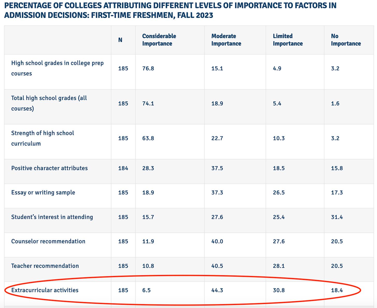 I also want to take a moment to help contextualise the relative importance of extracurricular activities in admission decisions. According to NACAC, it is the 9th most important factor, considerably less important than academic performance and character.