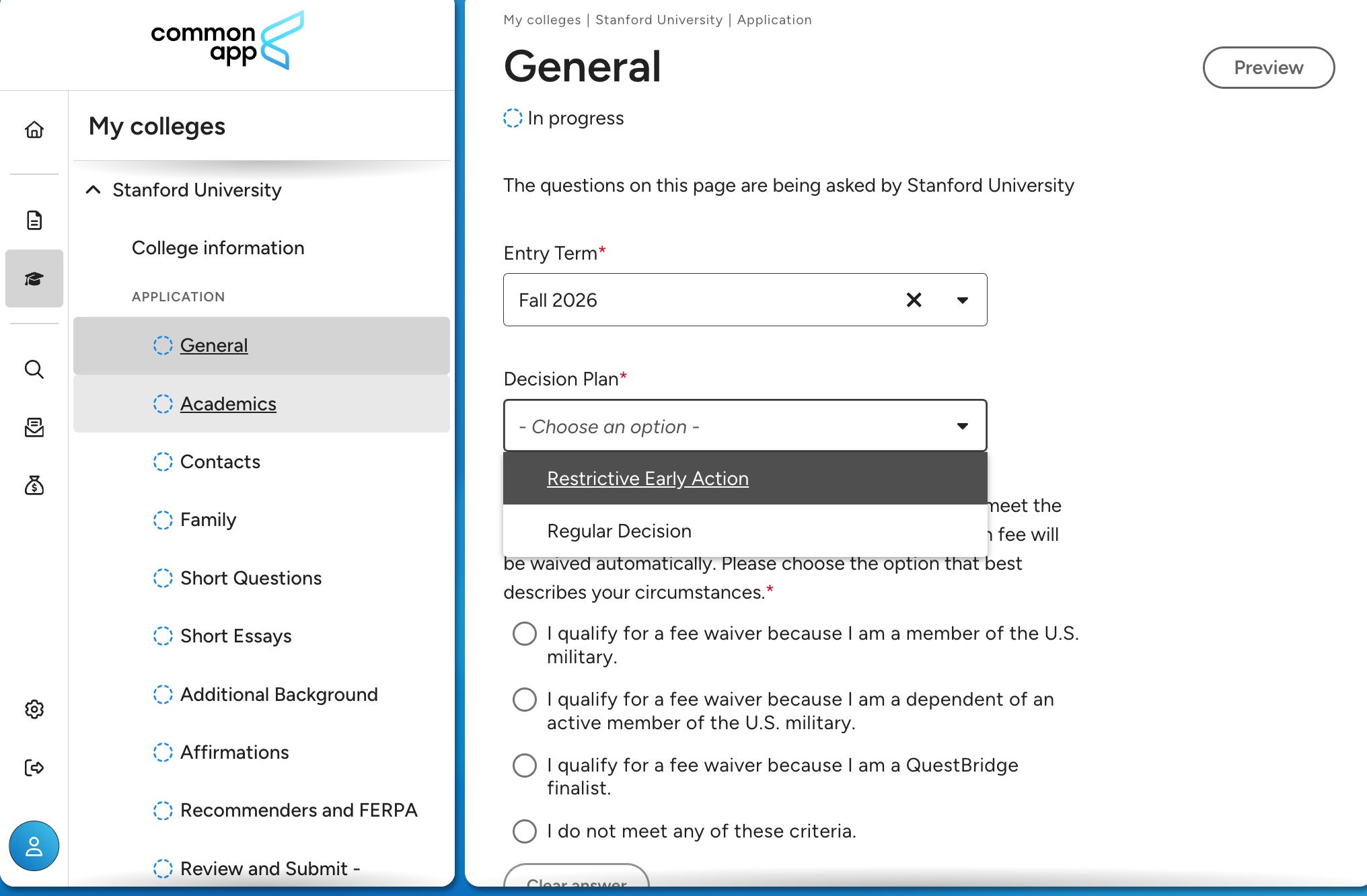 In the ‘General’ section of ‘College Questions’ you’ll often be asked to select an admission plan.