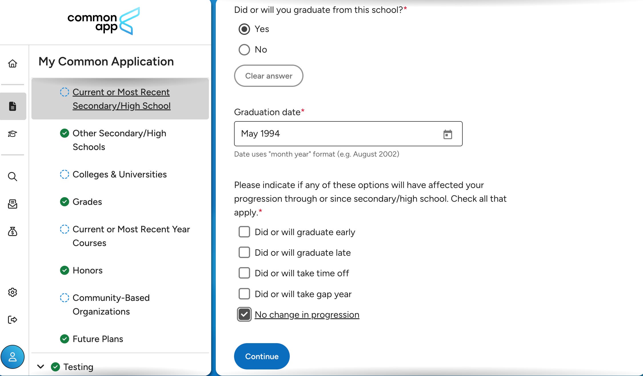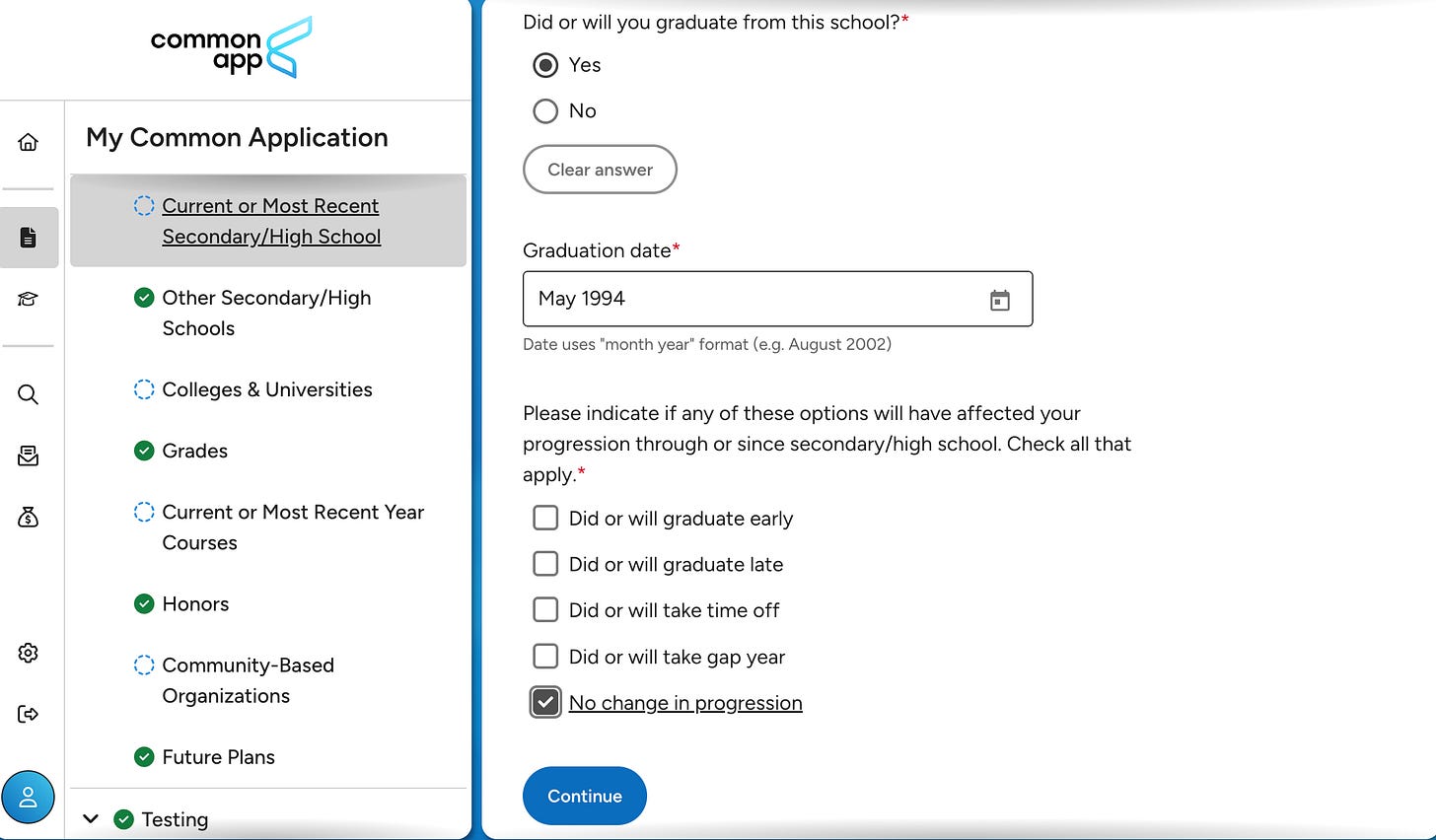 Most students will move directly from high school to college. If that is you, choose ‘No change in progression’.