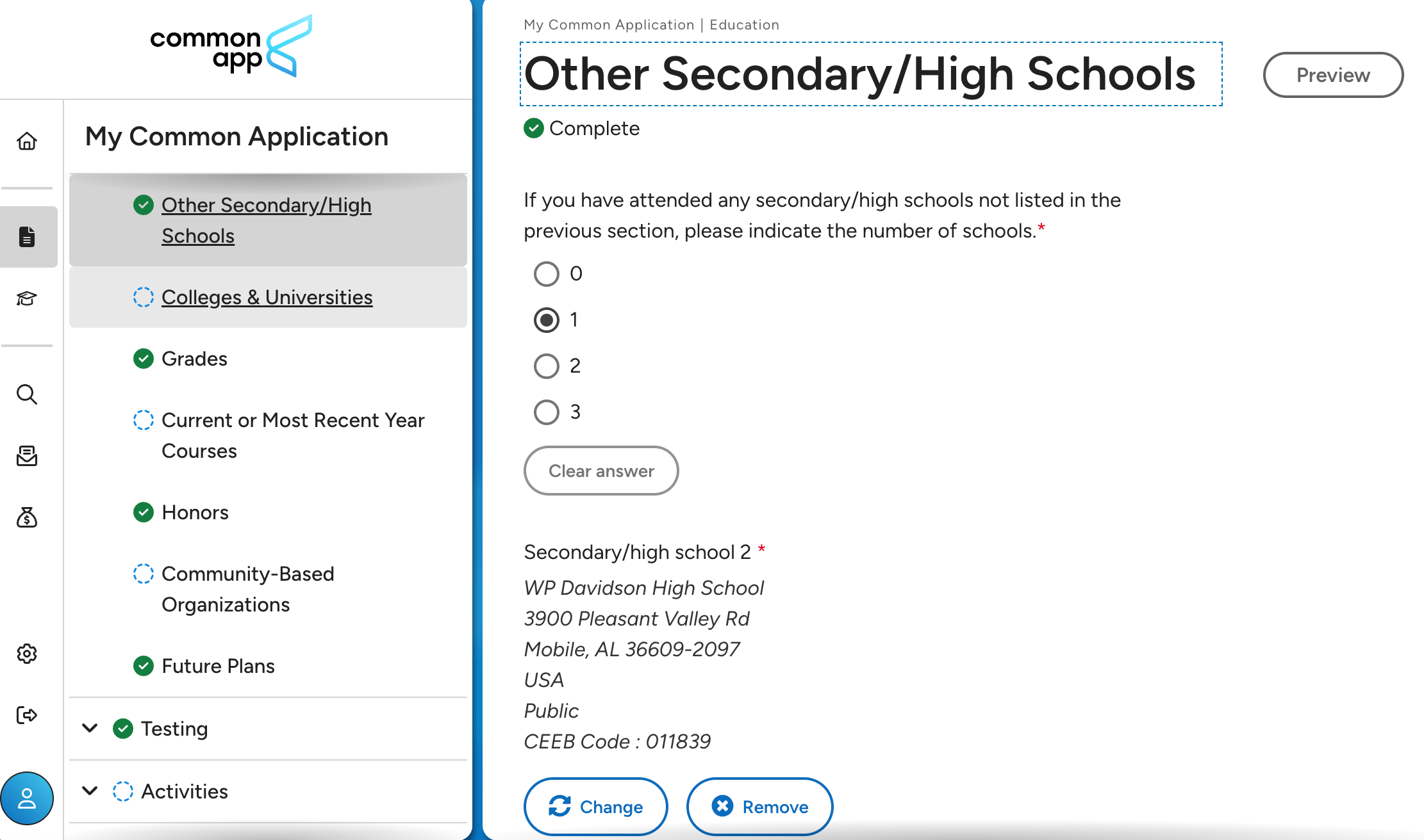If you’ve only attended a single high school all four years, this section is pretty straightforward - use the search to find your high school and then complete basic questions about when you attended, whether or not it’s a boarding school, and when you’ll graduate.