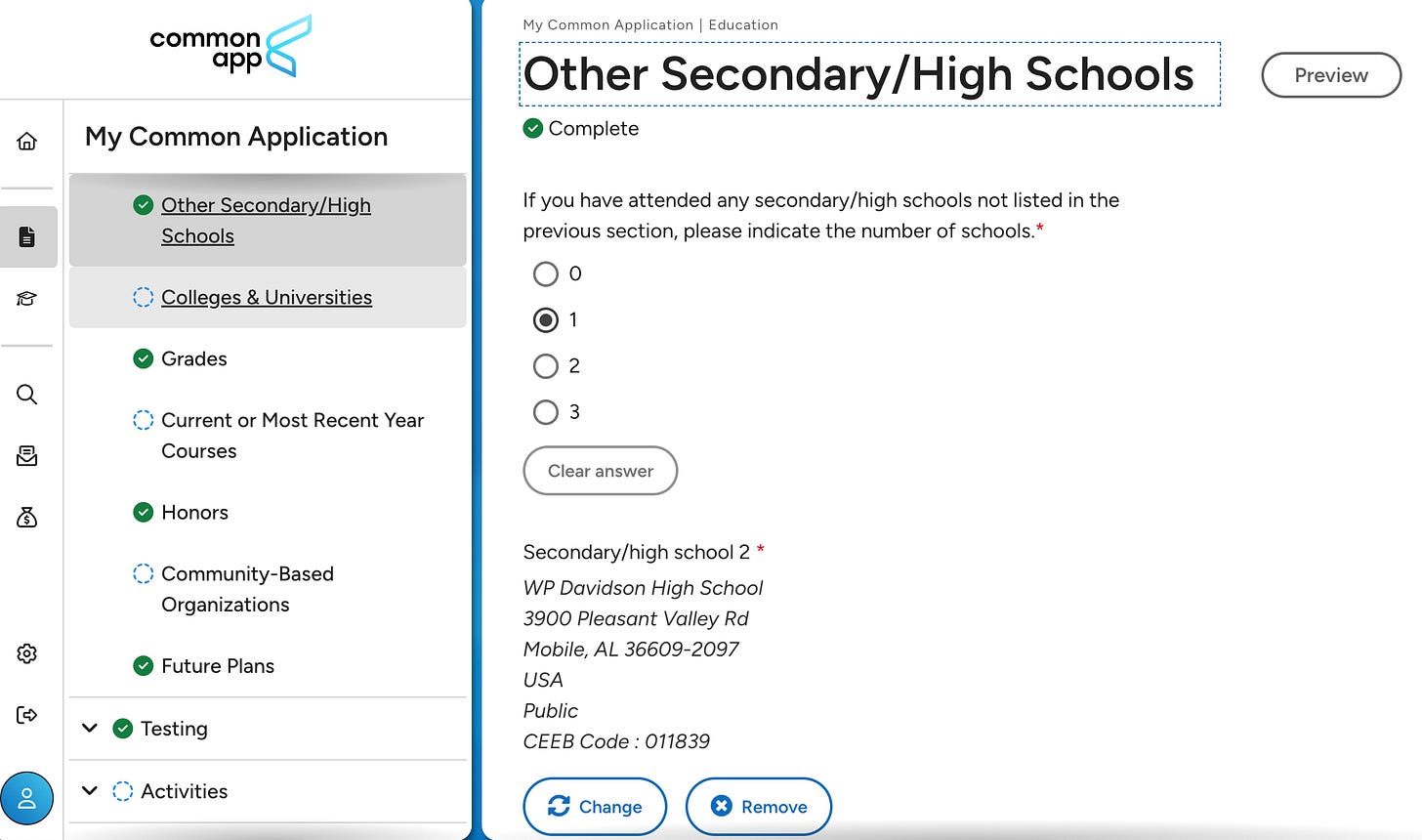 In this section of the Common App you’ll be asked to provide information about your academic background - what high school(s) you’ve attended, your courses and grades, and any college credits or classes you may have taken.