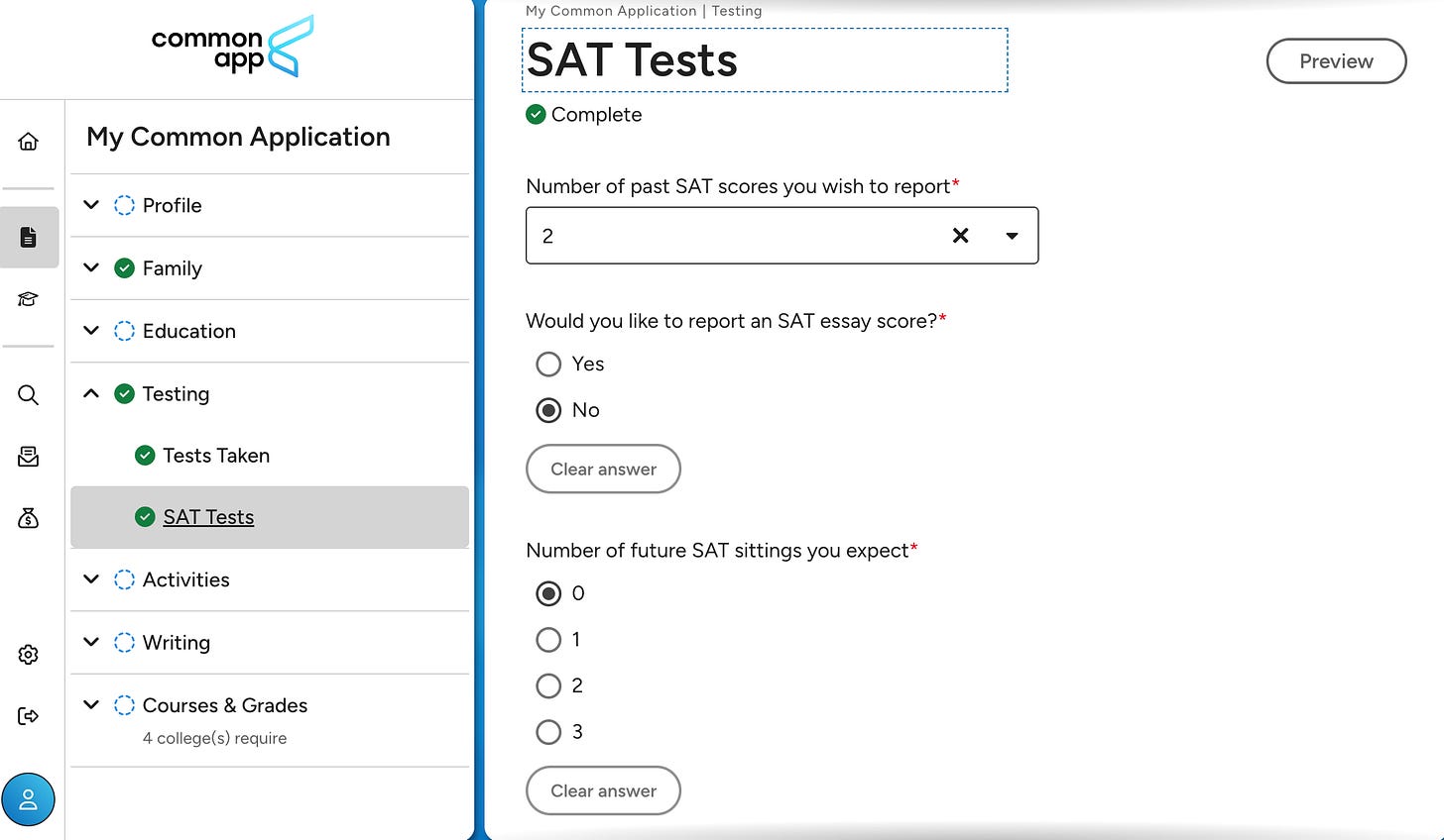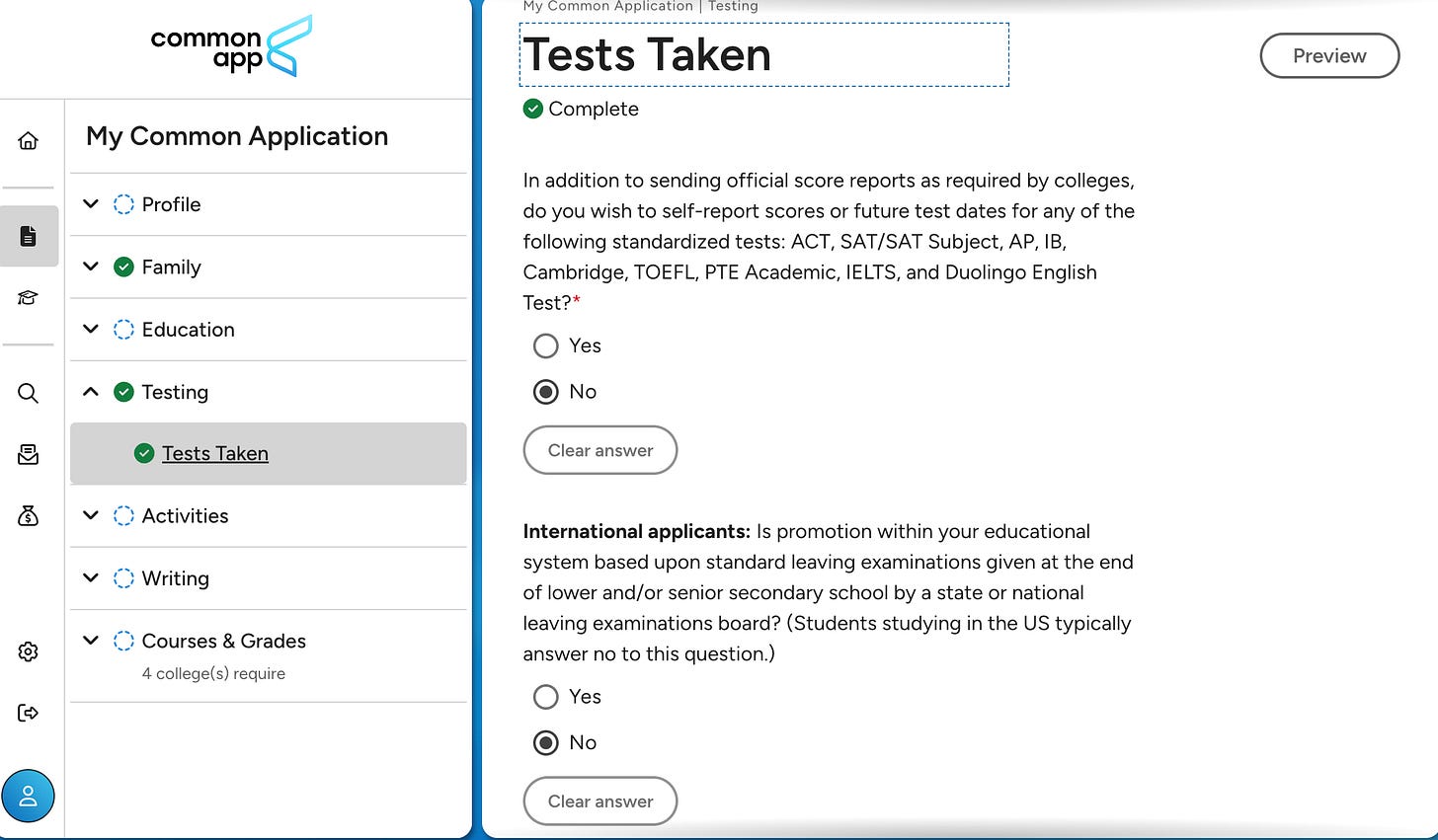 Here’s the truth - you don’t actually have to complete the ‘Testing’ section of the Common App (that’s why both of the high-level questions in this section are optional, not required).