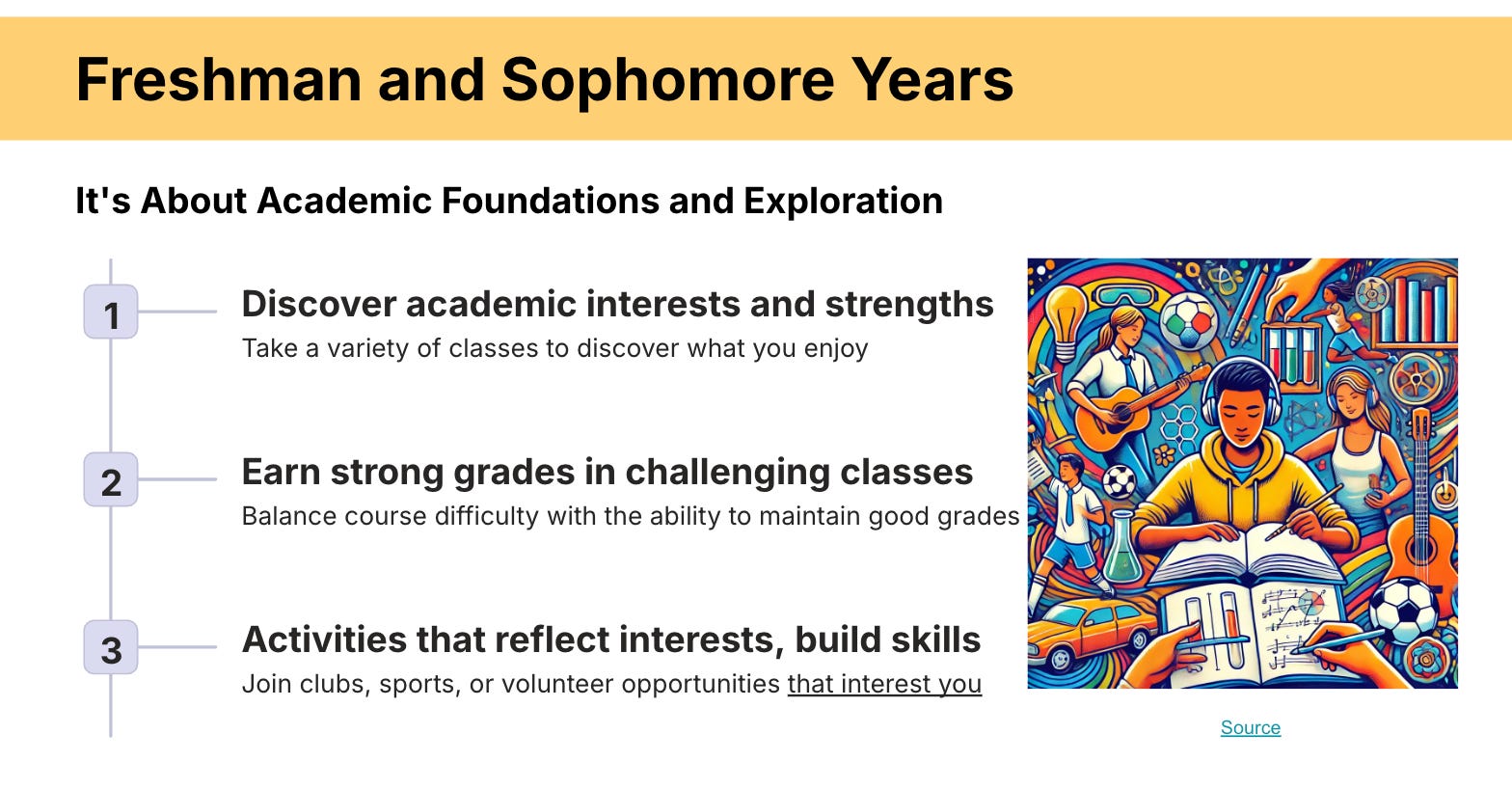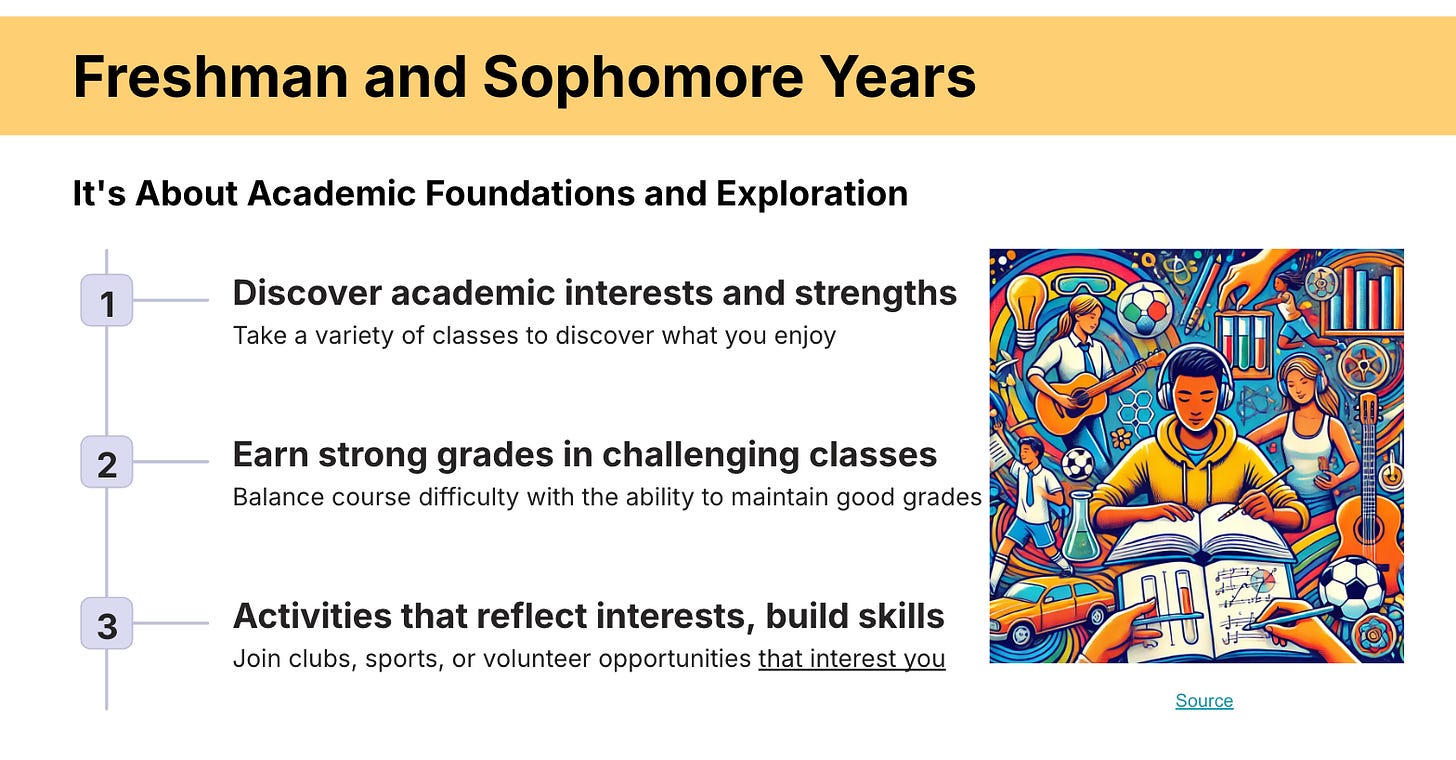 High school is your chance to grow, explore, and prepare—not just for college, but for life. Use Freshman and Sophomore years to start discovering what interests you, balancing academics with activities you love, and focusing on what feels right for you.
