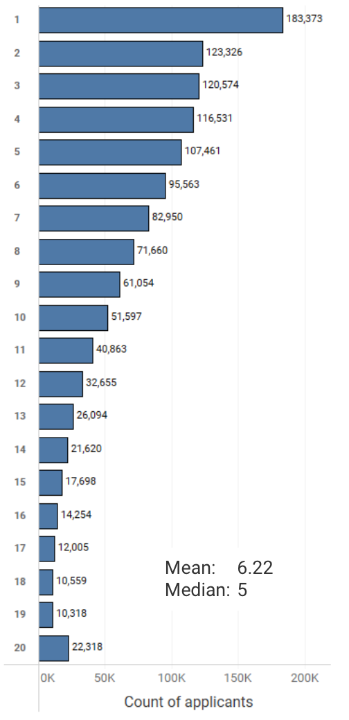 Perhaps not surprisingly, a minority of applicants applying to many schools skews the data. One third (33.5%) of the applicants applying to the maximum of 20 member institutions were international students.