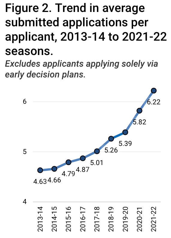 The average number of applications per applicant has been increasing. In 2013-2014, the average was 4.63 applications. In 2021-2022, the average was 6.22.
