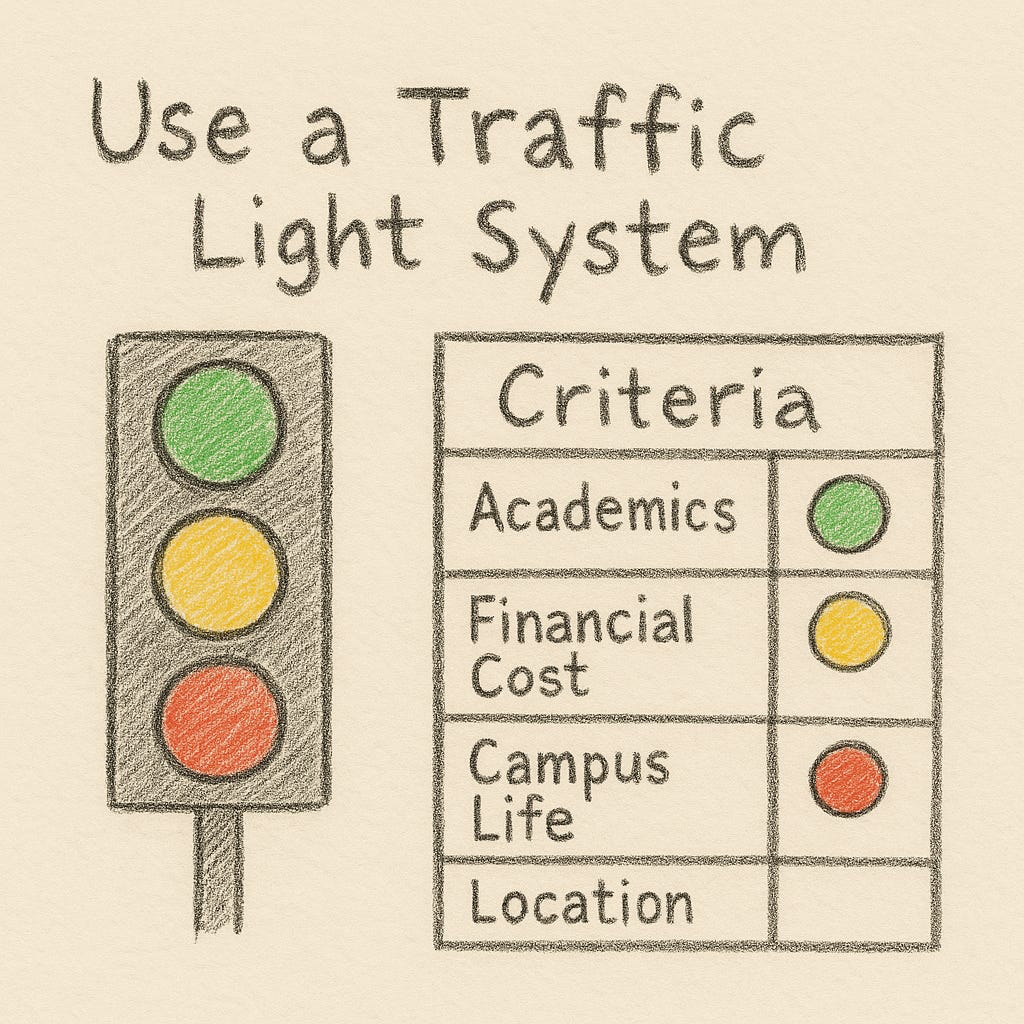 Create a simple visual chart by picking 3-5 key factors most important to you—such as academics, financial cost, campus life, athletics, location, or even whether or not you know other people going to that school.