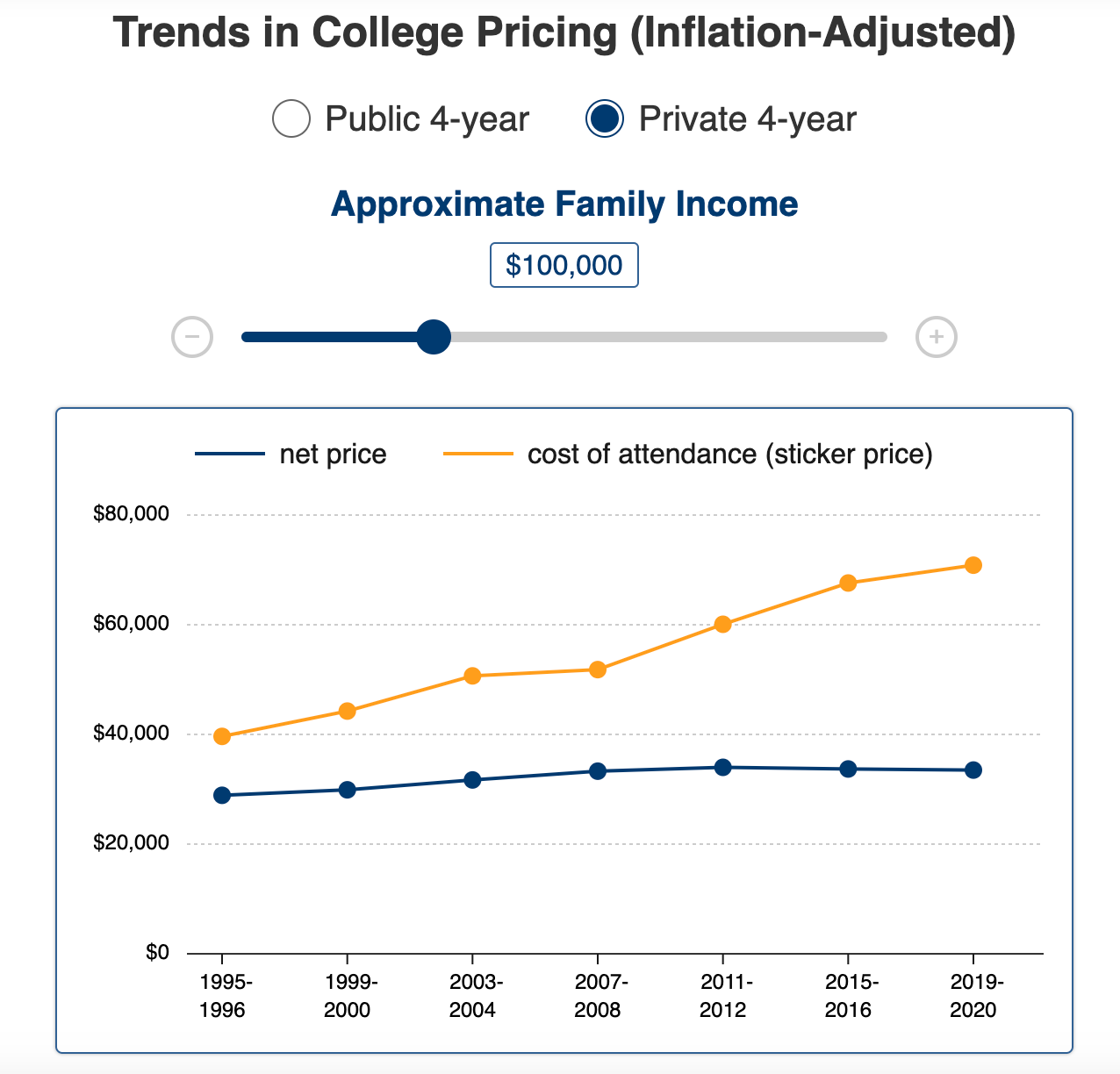 Here’s a view into cost of attendance vs net price from the Brookings Institution for a family making $100K a year and looking at private 4-year colleges.