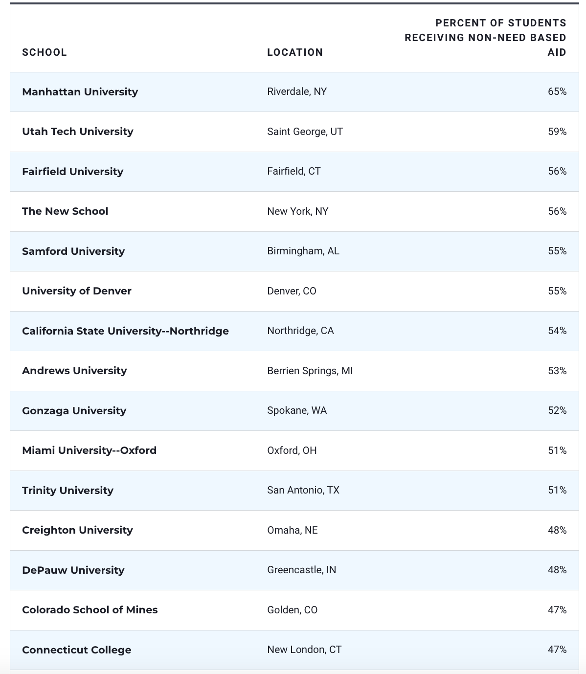 Some colleges are known for being more generous with merit-based aid, aka scholarships, which can make a big difference even if your family doesn’t qualify for need-based aid.