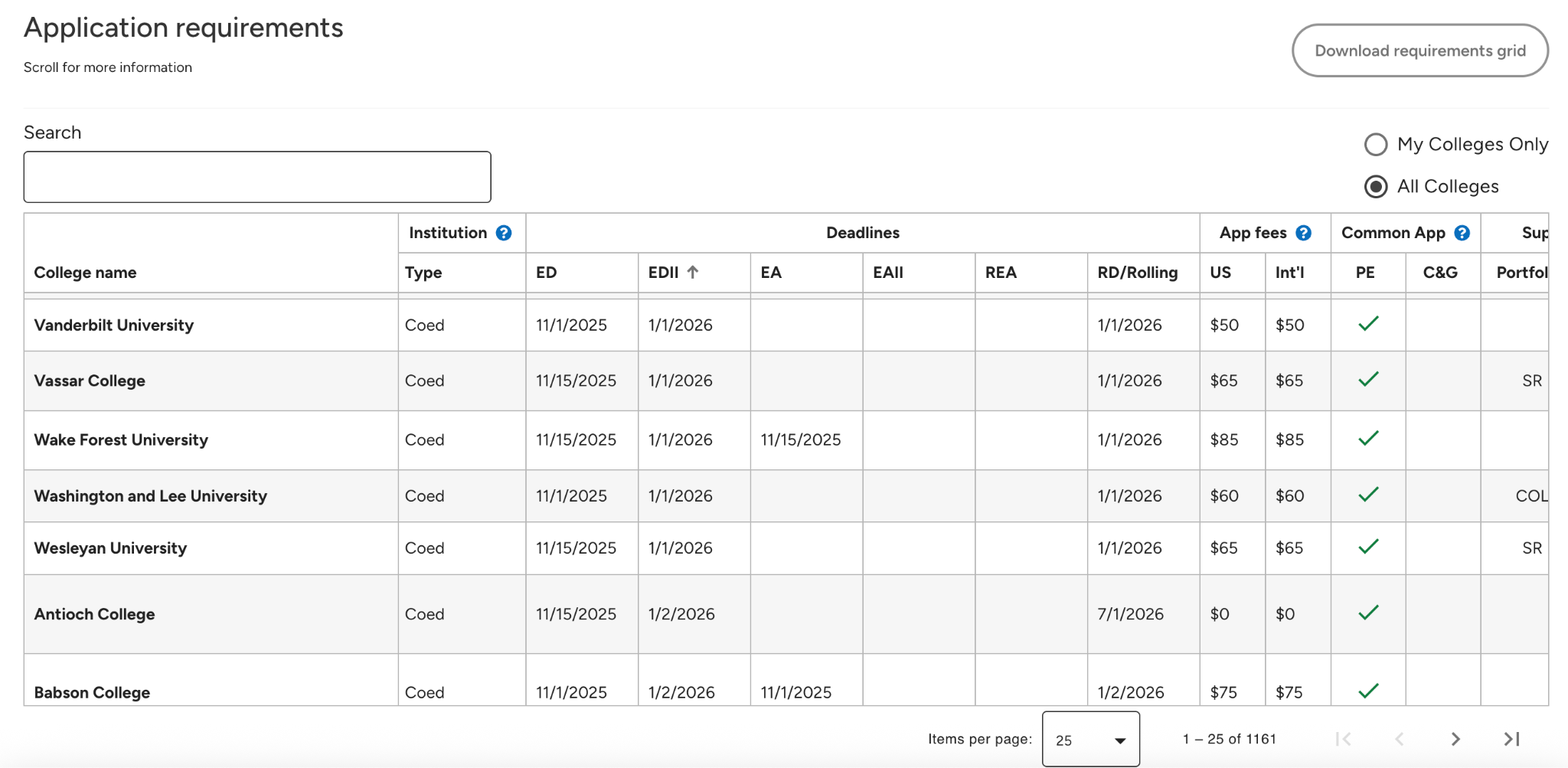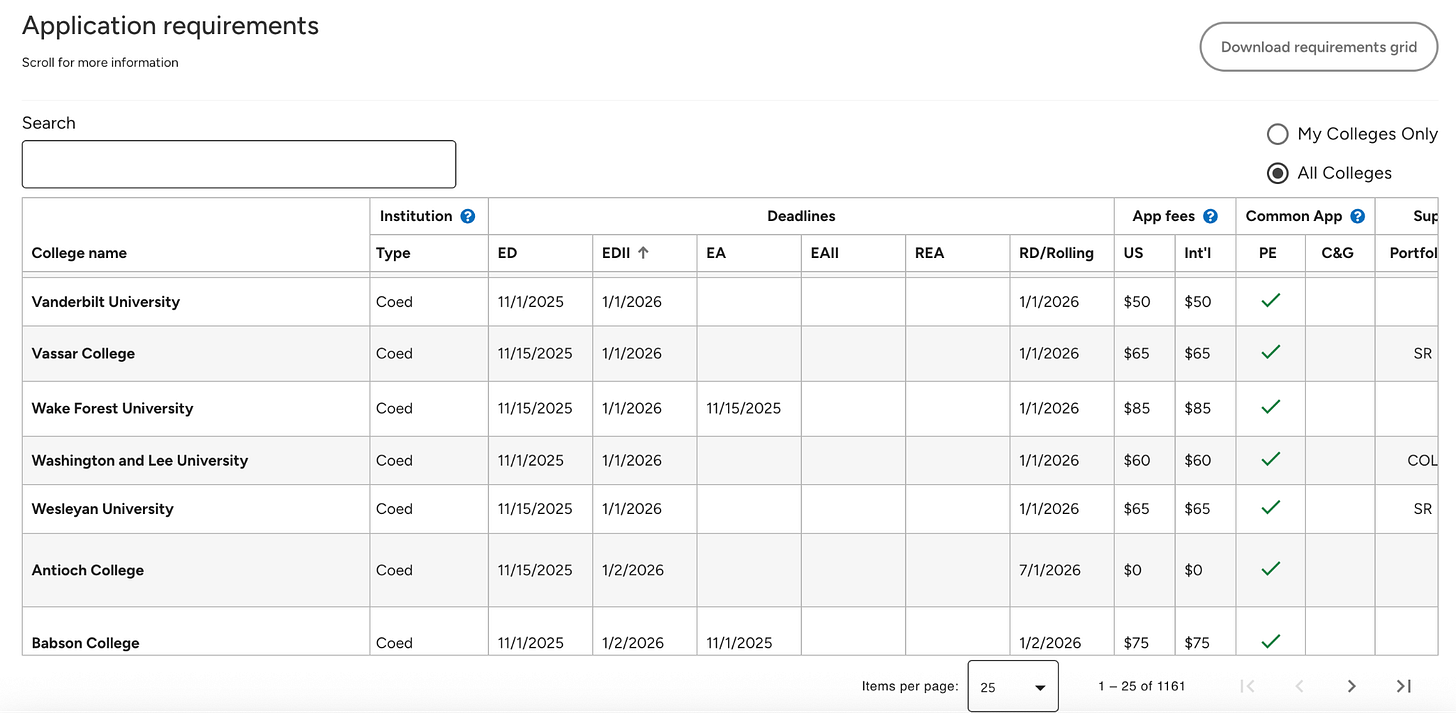 Pro tip: I use the features in the Common App to find these deadlines. Choose ‘College Search’, then ‘Application Requirements’, and then sort the list by EDII.
