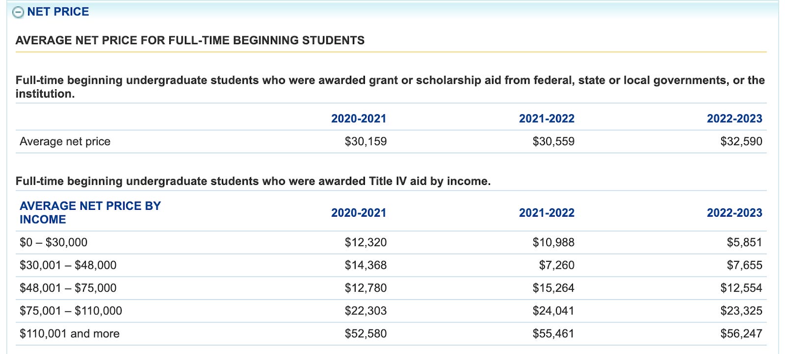 Benchmarks such as those provided by the Education Data Initiative help you know if a school’s “net” price is unusually high or low.