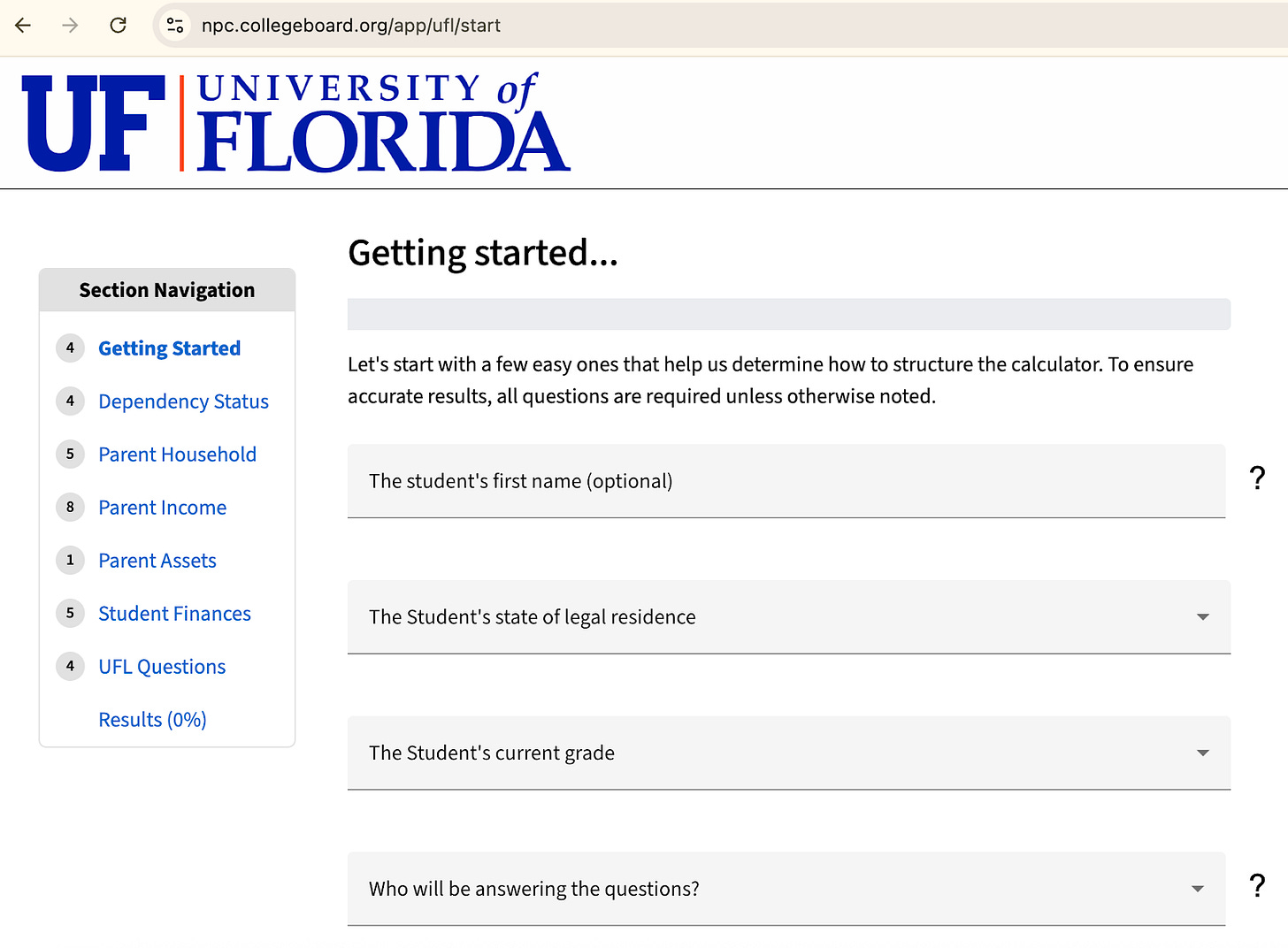 Find it on the college website. Look for “Net Price Calculator” in Admissions or Financial Aid. Though, it’s often fastest to just Google it, e.g. “net price calculator Boston College”, “net price calculator University of Florida”.